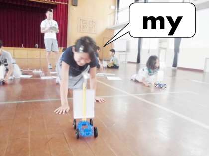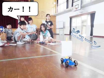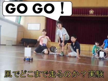 風の強さで車の進む距離はどうちがうのかを実験しました。弱い風の時と強い風の時では,車がすすむ距離がちがいました。やっぱり強い風の方がたくさん進みましたね。この結果に3年生は納得の表情。どうやら強い風の時に走っていると背中を強く押される感じがするから,そう思ったそうです。自分たちの生活に結びつけて答えを見つけ出したのですね!すばらしい!