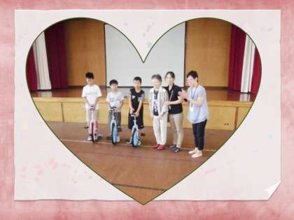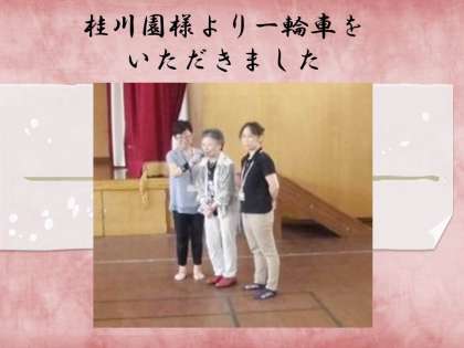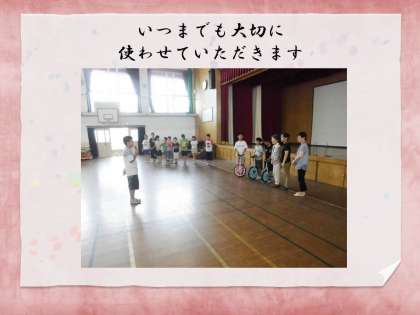 本日昼休みに,いつも様々な学習や活動でお世話になっている,桂川園の利用者の方や,職員の方にご来校いただき,一輪車を寄贈していただきました。みんな一輪車であそぶのが大好きでとても喜んでいました。これから大切に利用させていただきたいと思います。