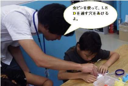 それを使った工作。ねこの尻尾部分に圧電素子の板をセット!目にはLED。二つをつないで、尻尾に刺激を与えると見事に目が点きました。