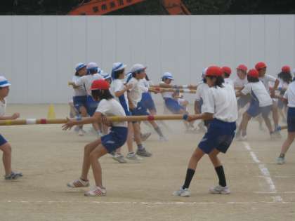 5年生の棒引きの練習の様子です。明日の本番では,どの色に勝利の女神が微笑むのでしょうか?
