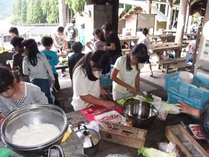 今日の夕食は『すきやき風煮』と『ご飯』。もちろん野外炊事で自分たちで作ります。昨日の野外炊事で学んだことを思い出しながら,手際よく野菜を切ったり,かまどの準備をしたりしました。