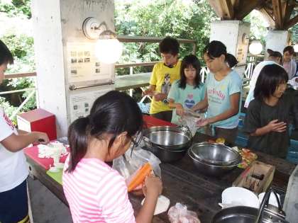 ちなみに今回のメニューは『カレーライス』『ハヤシライス』『クリームシチュー』『焼きそば』です。どのグループが何を作るかは,昨夜の全体ミーティングでの『大じゃんけん大会』で決定しています。出来上がったらみんなの料理を食べに行くというバイキング形式です。