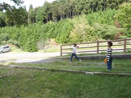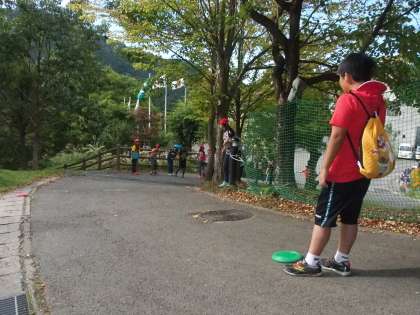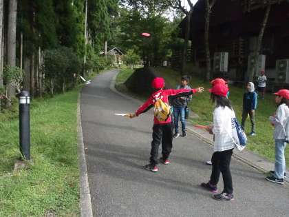 午後からの活動は2部構成です。フライングディスクゴルフとボルダリングに分かれての活動です。まずはフライングディスクゴルフの様子です。的に狙いを定めて,『えいっ!』と投げます。フライングディスクはまっすぐ的に向かっていくと見せかけて,風に乗ってはるかかなたへと消えてしまいました。なかなか難しいものですね。