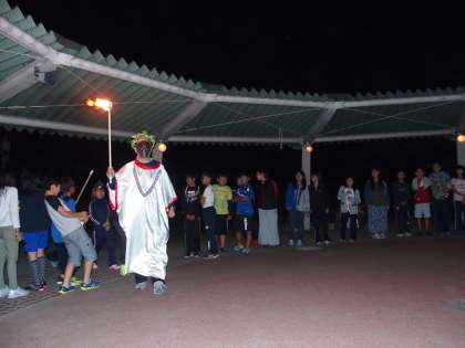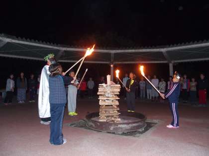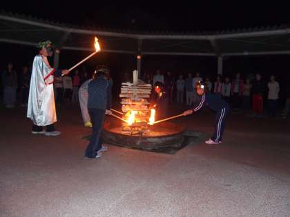 真っ暗な営火場に火の神が登場です。火の精たちに炎を分け与えてくれ,営火場にあたたかな炎が燃え上がりました。