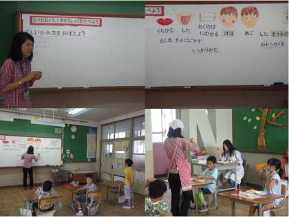 前回「口中調味」を教えて頂いた食育指導から数カ月がたちました。再び栄養教諭の山田先生に美味しく食べる方法について教えてもらいました。今回のテーマは『正しいかみかた』です。口を閉じて、舌を使って奥歯にのせる。ほほと顎をしっかりと動かして噛むことを教えてもらいました。そして、山田先生と一緒に給食を食べながら、実践しました。みんな、いつもよりもしっかりと噛んで食べられたようでした。