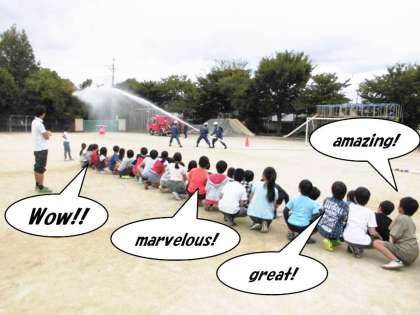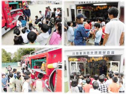 最初に運動場で放水訓練を見せていただきました。そして消防車の装備を見せていただき,消防団器具庫の見学をさせていただきました。