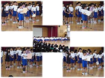 1年生のいきいき発表会は小学校生活で初めての運動会についてでした。作文の発表や各学年の演技,競技の感想を発表してくれました。がんばった玉入れのこと。楽しかったダンスのこと。かっこよかったお兄さん,お姉さんの組体操のこと。小学校生活の運動会は1年生にとって最高の思い出になったようです。