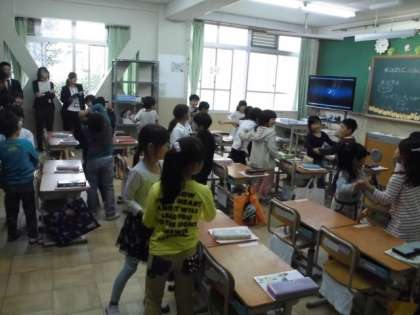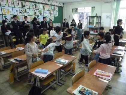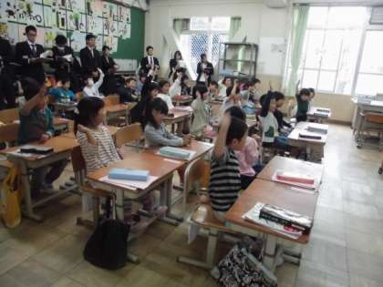 今日の1年2組の教室はいつもと何だか様子がちがいます。なんと他の学校の先生たちが見に来てくれたのです。ちょっとドキドキしていたようですが,いつも通りがんばりました。