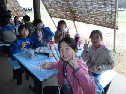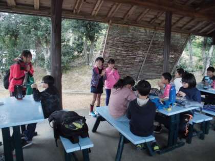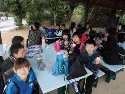 みんなで東屋で昼ごはんを食べました。おにぎりを食べながら,これからの楽しい生活について話している4年生に,雨なんて関係ありませんね!