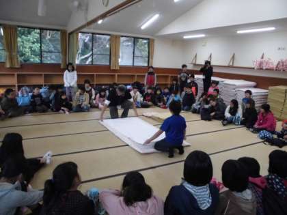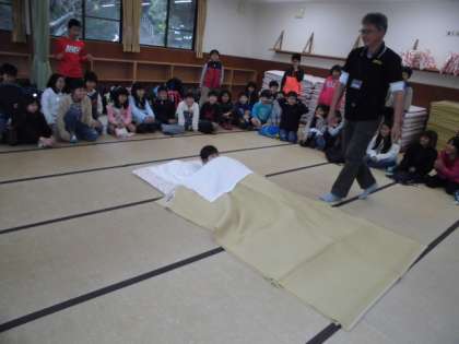 昼ごはんを食べたあとは,寝具準備のオリエンテーションがありました。代表の人がシーツで寝たり,シーツや毛布のかたづけをしました。これでもう寝具準備はばっちり?