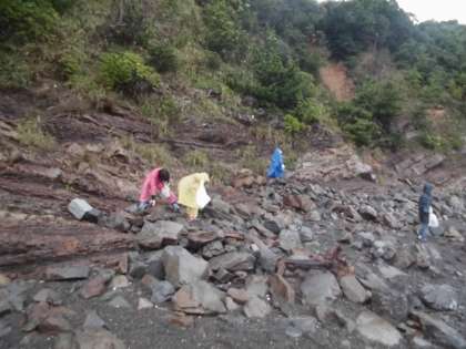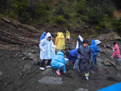 宮崎浜に到着した一向は石を探します。この石探しにも,それぞれのこだわりが見られました。丸い小さいかわいい石を探す子。絵がかきやすそうな平べったい石を探す子。形なんてどうでもいい,とにかく大きさで勝負する子などなど。みさきの家の思い出に拾った石。お家でも見てくださいね。