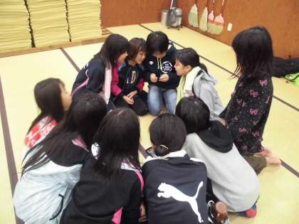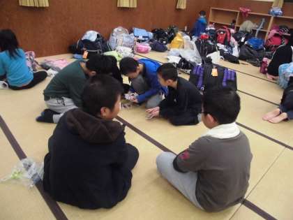 雨で濡れた体をお風呂で温めた4年生は,つかの間の休息をとります。ゆっくりとトランプをする人。まったりとウノをする人。ほっこりとする人。なんだか少し疲れたようですが,次は寝具準備をして,夕食です。