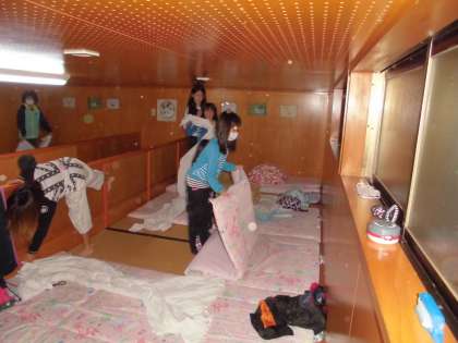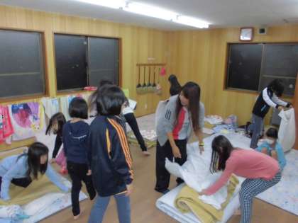 『さあ,バンガローで寝具のかたづけをがんばろう!』