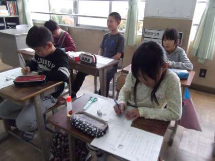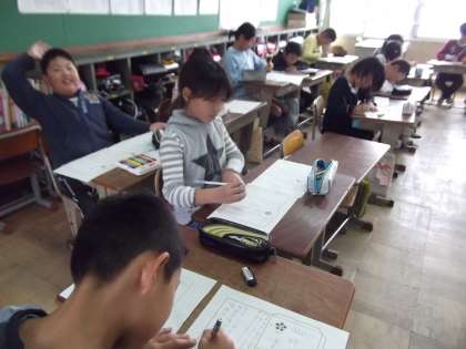 今日ははがきの書き方を学びました。夏休み前に暑中お見舞いを書いた3年生。『はがきの書き方なんて,もう分かってるさ!』というわけで,今日は学芸会の招待のはがきを書きました。気持ちをこめて,心をこめて,愛をこめて・・・。