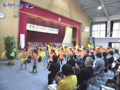 オープニングを飾るのは,桂川園の皆様と川岡東児童館の子ども達です。みんなで声を合わせて,心も合わせて『世界に一つだけの花』を歌いました。そして,『ヤングマン』ではフラッグを使って踊りました。子ども達のかわいらしいステージに,会場は和やかな雰囲気になりました。また,子ども達の踊りを見て,西京区のゆるキャラ『たけにょん』も飛び入り参加してくれました。