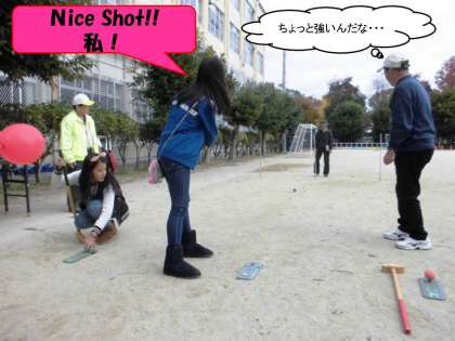 川岡東小学校の運動場では,グラウンドゴルフの体験コーナーがあります。