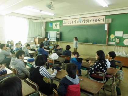 4年生の教室では冬休みの思い出を熱く語っていました。冬休みに旅行に行ったこと。旅行でおいしいものを食べたこと。福袋ですてきなものが入っていたこと。たこあげをしたこと。いろいろな発表があり,聞いている友だちもみんな笑顔でした。