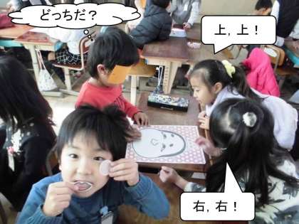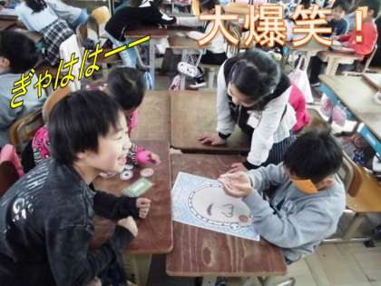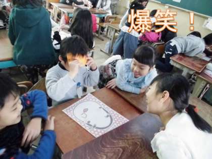 2年生は初めて福笑いをした子もいたようですが,かんたんで分かりやすいルールの遊びなので楽しんで遊ぶことができました。『福笑い』が2年生の教室で一大ムーブメントを巻き起こしそうです。