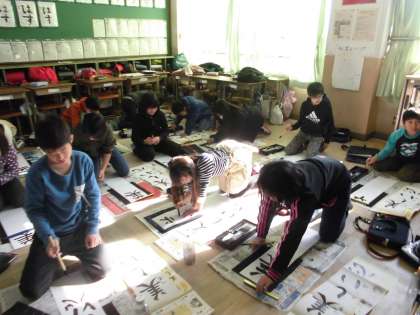 4年生は『美しい心』を書きました。初めて画仙紙に書くという子もいて,ちょっとどきどきしていました。いつもとちがい床に新聞をひいて書いたのですが,いつもどおり落ち着いてきれいな字を書くことができました。
