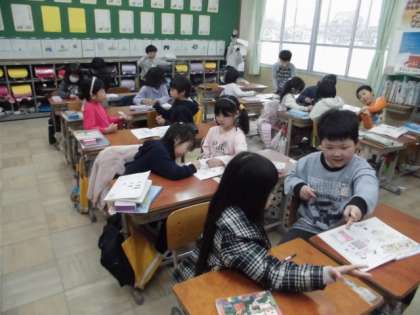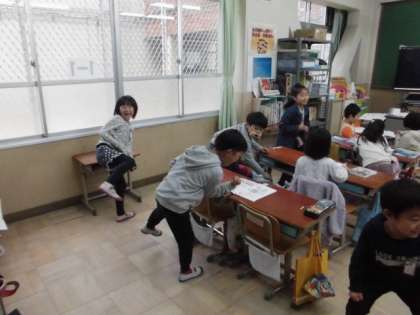 ジャンケンをして「ばしょとりゲーム」をしました。ジャンケンに勝ったら1マス色を塗り,どっちがたくさんばしょをとったか勝負します。ジャンケンに勝って大喜びする子あり,くやしがる子あり。大盛り上がりの算数の時間でした。