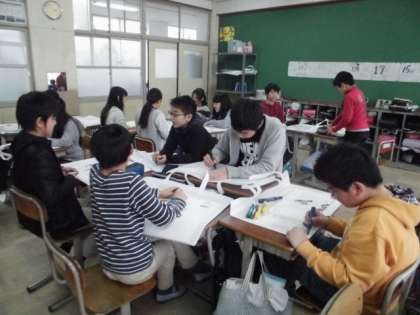 作品バッグに絵をかきました。みんな思い思いの絵をかいていました。自分の好きなキャラクターやオリジナルキャラクター,友だちからのメッセージをもらっている子もいました。