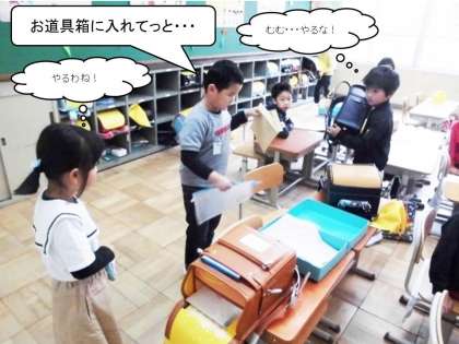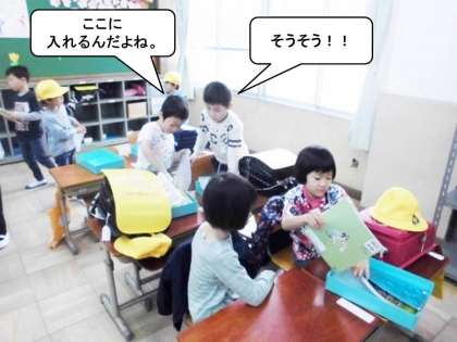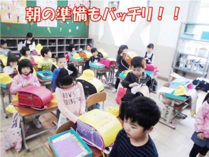 『おはようございます!』の元気なあいさつのあとは,朝の準備です。きのう,先生に教えてもらったことを思い出しながら準備をしていきます。朝の準備ができた子は,となりの友だちに教えてあげていました。優しいですね。