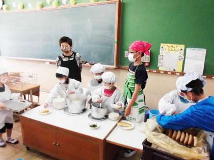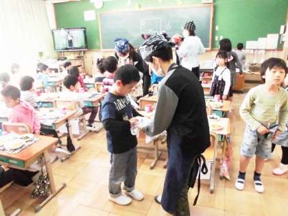 そう考えた6年生は,給食おたすけ隊を結成することにしました。そして1年生の給食のお手伝いをしに行ったのです。運び方を教えたり,エプロンのたたみかたを教えたりと大活躍のおたすけ隊なのでした!