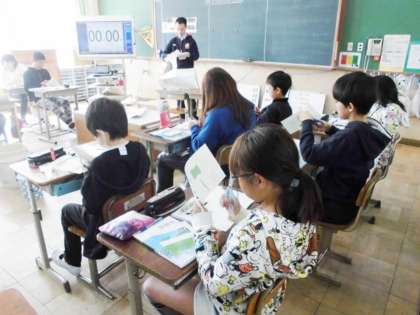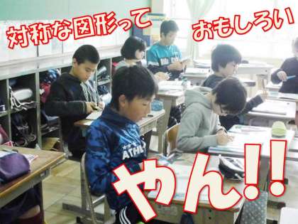 2つに折ってぴったり重なる形,まわしてぴったり重なる形になかまわけをしました。真ん中で折ったり,くるくるまわしてみたりいろいろ試して考えました。