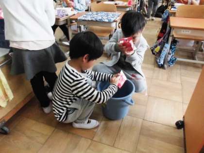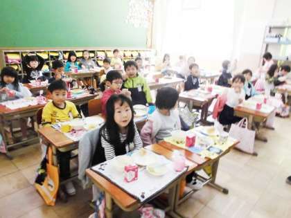 食べ終わったあとは,牛乳のあとかたづけをしっかりと。給食生活4日目の1年生はもうすっかりと慣れているようでした。