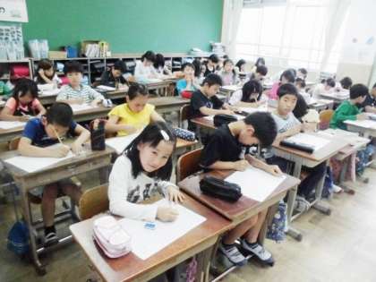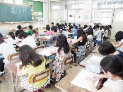 3年生の書写は山中先生と学習します。今日は硬筆の学習でした。見本と同じように,ていねいていねいにをモットーに指や手が痛くなりながらも,一生懸命に書きました。