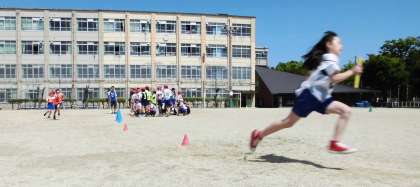 5年生が体育で学習しているのは,もちろん2番。バトンに魂をこめて,情熱をこめて,走ります。