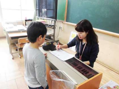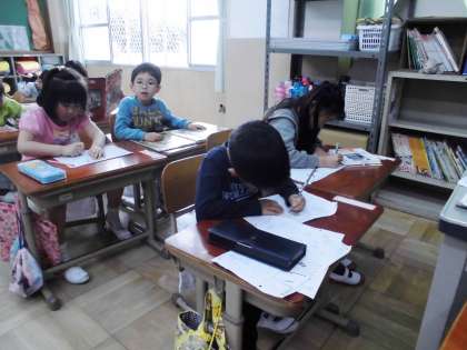 ひらがなの学習をどんどん進めている1年生。今日のひらがなは『と』です。たった2画のひらがなですが,書いてみるとバランスがけっこう難しいものです。悪戦苦闘しながらもがんばって書きました。