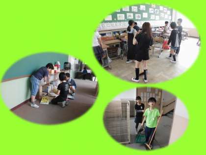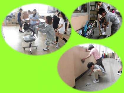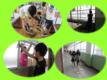 教室やろうか,理科室などの特別教室。5年生はいろいろな場所をそうじしています。それぞれが割り当てられた場所で,しっかりと自分の仕事を,責任を持ってやっています。窓ふきはS村先生直伝の『秘技!新聞紙ふき』でピッカピカです。自分たちが学習で使う場所です。いつもきれいにしておきましょうね。