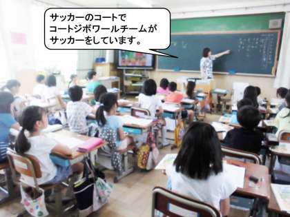 教科書の絵の中の言葉を使って文作りをしました。絵を見てみると動物たちが楽しそうにスポーツをしています。しかし,さらによく見てみると言葉はカタカナの言葉ばかり。ひらがなとカタカナをじょうずに使いわけて,動物たちのスポーツフェスティバルの様子を文で表現できました。1時間,頭の中はカタカナでいっぱいでした。