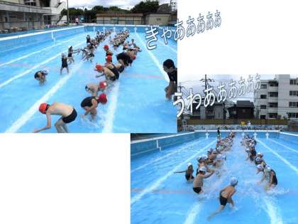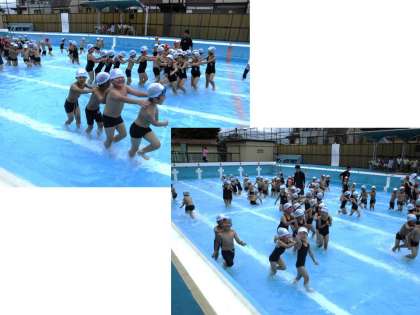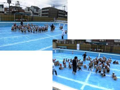 プールの中を走ったり,水のかけあいをしたりと,子どもたちは水あそびを満喫しました。特にみんなでやった『貨物列車』はとても楽しかったようです。