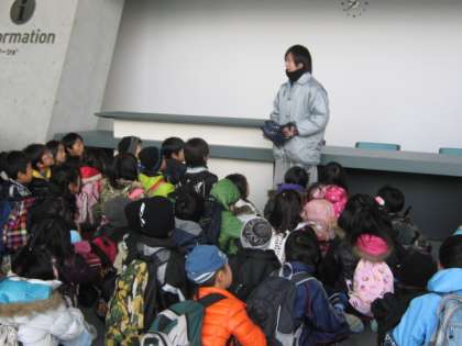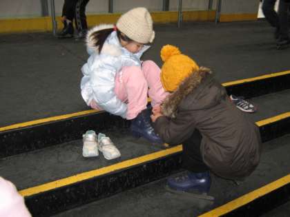 アクアアリーナ到着後、スタッフさんのお話を聞き、いざスケート場へ。まずは靴をはきます。事前に練習したおかげでみんなうまくはけていました。