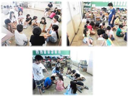 今日のにこにこタイムは絶好のお天気でした。外遊びグループはかなり暑かったようですが,楽しく遊ぶことができたようです。教室遊びグループも6年生がリーダーとしてひっぱってくれて,みんなで楽しく遊ぶことができました。