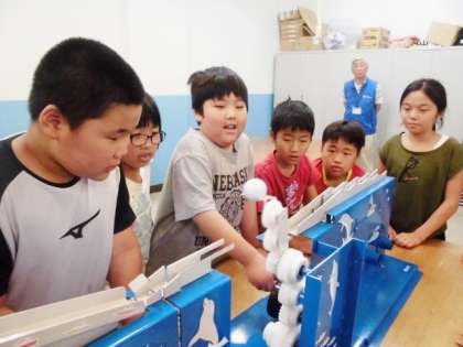 工房学習では,調子が悪くなった『ゴルフボールを運ぶマシーン』のメンテナンスをしました。六角レンチを使ってグループで協力してメンテナンスを行いました。作業終了後には,3つのグループのマシーンをつなげてうまく運べるかを確かめました。