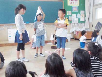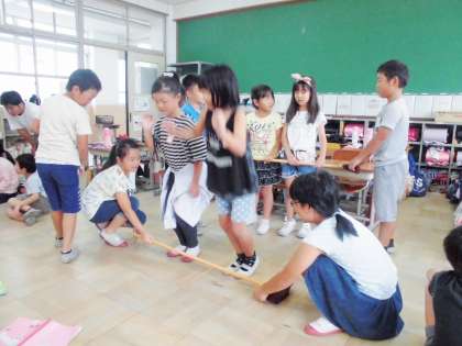 3年生の感動的な『川東ネオタイフーン』から一夜明け,3年生はあの感動を2年生に伝えに行きました。どうすれば上手に『台風の目』ができるのか,『台風の目』のコツを一生懸命に伝えました。それを聞く2年生も真剣な表情です。ほうきを棒にみたてて実際にとぶ練習をするグループもありました。