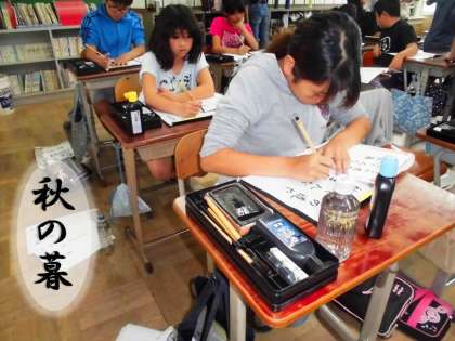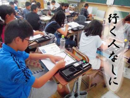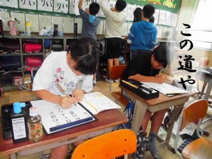 6年生の書写は小筆を使って,みなさんご存じ松尾芭蕉のあの俳句を書きました。ひらがなは点画のつながりを意識して書き,それぞれの行間もしっかりと考えて書いていきます。納得のいく作品ができあがりましたか?