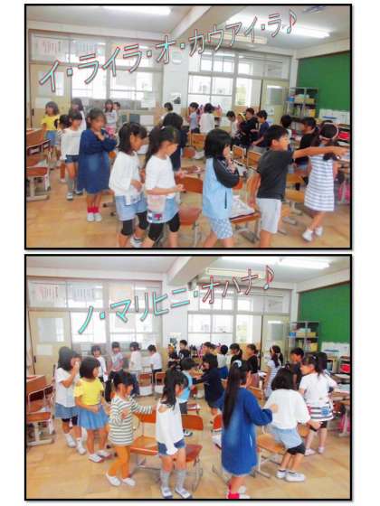 あそび係が中心となってみんな遊びをしました。今日の遊びはイスとりゲームです。曲はもちろん『アロハ・エ・コモ・マイ』です!運動会でおどったダンスをおどりながらイスのまわりをぐるぐるまわる2年生・・・。