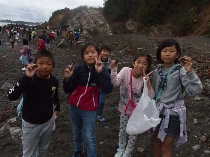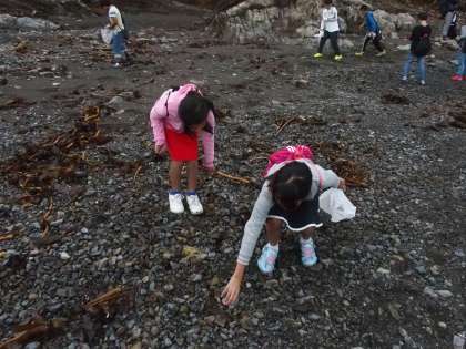 海岸についた4年生は磯観察ができないくやしさを石拾いにぶつけました。