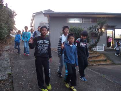 6時になりチャイムがなるとバンガローから続々と子どもたちが出てきて,60畳に向かいます・・・。今日の活動が楽しみで待ちきれない様子です。