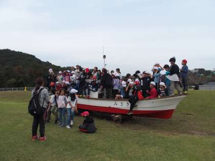 ネイチャービンゴのあとに学年写真を撮りました。みさき丸の上で楽しそうに笑うたくさんの顔。みんないい顔してるぞ!!
