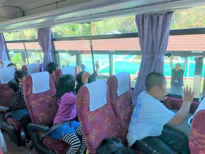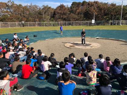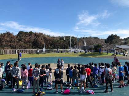 4年生の退所式はファイヤー場,爽快な青空の下で行われました。お世話になた職員の方にしっかりとお礼を言いました。