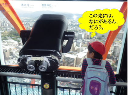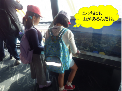 社会科で「京都は盆地です。」「碁盤の目のようなんだ。」と言われても,それは本当なのか?そんな疑問を晴らすために,3年生は社会見学で京都タワーへ行きました。頂上から見た京都は,三方が山で囲まれ,烏丸・堀川等の縦の通りに,塩小路・七条等の横の通りが確かに交わる碁盤の目をしていることを確認することができました。