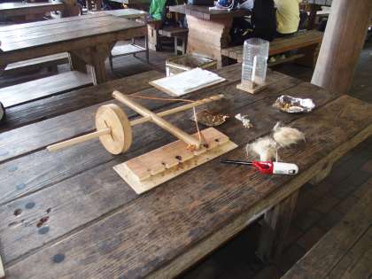 第1炊事場に移動し,火おこし体験をしました。私たちの生活になくてはならない『火』。いまではマッチやライター,チャッカマンなどで楽につけることができます。しかし,そんな物がなかった時代。人はどうやって火をつけていたのでしょう?