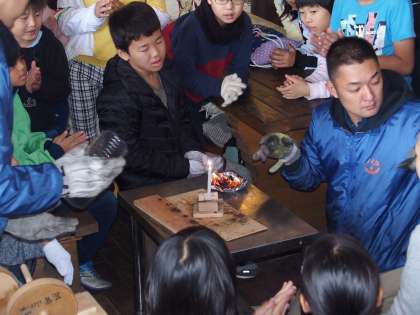 見ているとつきそうで中々つきません。坂尻先生も協力してやっと火をロウソクにともすことができました。