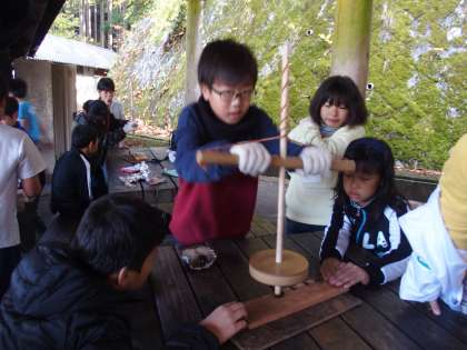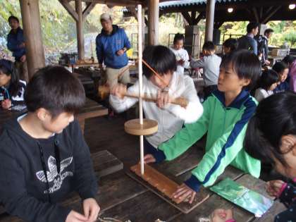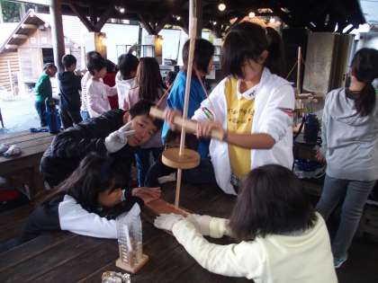 先生たちの実演を見ていた5年生。心の中では『楽勝だぜ!』と思っていたことでしょう。しかしやってみると,難しいことこの上なし。煙は出るのですがなかなか火種がつきません。そんな中,あるグループから