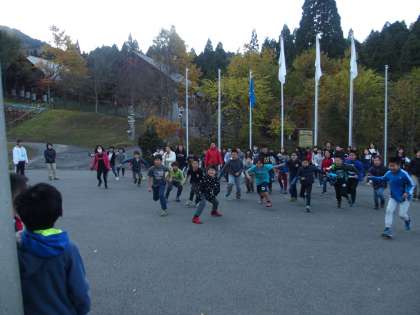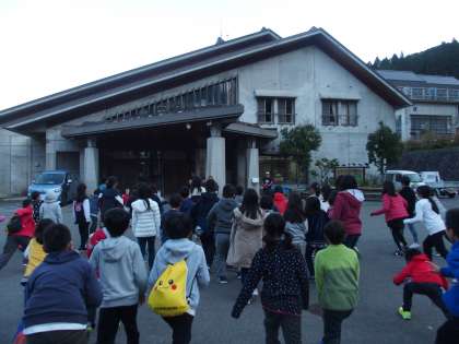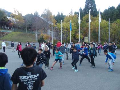朝食は8時10分から。まだ少し時間があります。するとやはり始まりました。川岡東小学校名物『本館前 de だるまさんがころんだ大会』です。